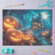 Enter a twilight world where jack-o’-lanterns flicker like sentinels and a haunted house looms in gothic splendor. This atmospheric design features glowing pumpkins with expressive faces lining a misty path, leading straight to an eerie manor crowned by turrets and glowing windows. Bats swirl above a full moon, while twisted trees stretch like curious spectators over golden leaves.