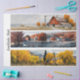 A warm and nostalgic three-panel collage designed for 26x6 handsaw decoupage, celebrating the golden beauty of autumn across rustic landscapes. The top panel features a red barn with a weathered roof, a windmill, and grazing cows framed by orange and yellow foliage. The middle panel captures a tranquil lakeside village, where vibrant autumn trees reflect in still waters, creating a peaceful symmetry. The bottom panel showcases a yellow barn surrounded by golden willow trees, a wooden fence, and distant mountains. Each horizontal design blends seasonal richness, rural charm, and storytelling—perfect for transforming vintage blades into cozy fall wall art.
