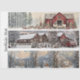 A festive and serene three-panel collage designed for 26x6 handsaw decoupage, celebrating the warmth and wonder of winter. The top panel features a red barn adorned with wreaths, garlands, and wrapped gifts, flanked by two sheep and a snowy pine forest. The middle panel showcases a charming red building labeled “Santa Claus,” with a vintage truck parked out front and twinkling holiday lights. The bottom panel captures a peaceful snowy landscape with a cabin, a church steeple, and a lone figure walking through the quiet woods. Each horizontal design blends rustic holiday charm, faith-rooted storytelling, and seasonal magic—perfect for transforming vintage blades into heartwarming wall art.