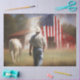 This heartfelt decoupage paper captures a rural Americana scene featuring a cowboy in plaid walking alongside a white horse toward a barn painted with the American flag. Red and white stripes stretch across the barn’s siding, while a blue field with white stars crowns the upper corner. Surrounded by grassy fields and trees, the painterly style adds nostalgic warmth and quiet reverence—perfect for tribute art, seasonal decor, and vertical formats like sleds or 10x29 plaques.