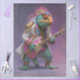 This bold panel features a turquoise-and-orange chameleon mid-performance, decked out in full glam-rock glory. With a pink and blue mohawk crest, gold chains, and a white jacket adorned with stars, eagle emblems, and metallic patches, this lizard is pure showstopper. A pink electric guitar with gold hardware adds flash and flair, while the soft purple-pink gradient background sets the mood for fantasy, rhythm, and reptilian swagger.
