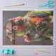 Esta fotografía vibrante y detallada muestra un loro adornado con un gorra pirata y una chaqueta, que sugiere un tema lúdico e imaginativo. Las plumas del loro muestran una rica gama de colores, predominantemente verde con salpicaduras de rojo, amarillo y azul. El gorra pirata está adornado con patrones intrincados, y la chaqueta se agrega a la caprichosa representación del pájaro como un personaje pirata. La imagen está firmada y creada por "RHDesigns by 2chattychicks".