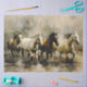 Decoupage paper featuring five horses galloping through shallow water, captured mid-motion with splashes and flowing manes that radiate energy and freedom. The background blends muted tones and expressive brushstrokes, creating a painterly, abstract atmosphere. With varied horse colors—white, brown, and black—this design offers visual contrast and emotional depth. Ideal for trays, journal covers, furniture art, and DIY rustic or western-themed projects.