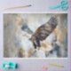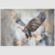 La imagen es un cuadro de un águila calva en vuelo. El águila se representa con sus alas esparcidas por el ancho, mostrando unas plumas detalladas en tonos marrones, blancos y negros. El fondo es una mezcla abstracta de colores mullidos como el gris, el beige y el blanco, que contrasta con la representación vívida del águila. Esta imagen es interesante debido a la dinámica representación del águila, capturando un sentido de movimiento y libertad, y la mezcla artística de elementos realistas y abstractos. águila calva en vuelo, plumas detalladas, alas extendidas, fondo abstracto, colores apagados, representación dinámica, movimiento y libertad, mezcla artística, realista y abstracto, RHDesigns by 2chattychicks.