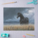 Un semental frisón negro de pie alto en un campo de hierba bronceada por el viento bajo un cielo dramático de tormenta —perfecto para amantes de los equinos, fanáticos del arte de fantasía o cualquier persona atraída por escenas audaces y majestuosas llenas de atmósfera y fuerza.