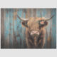 La imagen muestra una vaca Highland con una piel larga y resbaladiza parada frente a una cerca de madera templada pintada con un patrón angustiado de azul y marrón. La vaca tiene grandes cuernos curvados y está decorada con motivos florales en uno de sus cuernos, flores rosas y hojas verdes. Esta imagen es interesante debido a la yuxtaposición del fondo rústico con la vaca decorada, creando una escena visual atractiva y única. Cobertizo de vaca Highland largo de piel conmovedora, valla de madera angustiada, disposición floral, flores rosas, hojas verdes, fondo rústico, retrato animal único, imagen artística de vaca, escena visualmente atractiva.