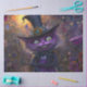 La imagen representa una escena fantástica y caprichosa con un gato morado grande y sonriente con ojos verdes brillantes. El gato lleva un gorra alto y elaborado adornado con flores, joyas y una gran joya central. El fondo está repleto de elementos vivos y coloridos como flores, farolillos y diversos objetos decorativos, creando un ambiente mágico y encantador. El entorno parece ser un fantástico jardín o una calle, con una luz cálida que ilumina el lugar. La expresión y la vestimenta del gato le dan un sentido de misterio y encanto a la imagen, lo que la hace visualmente cautivadora e intrigante. Espectáculo caprichoso, fantástico gato, púrpura, brillantes ojos verdes, gorra elaborado, decoración floral, gorra con joyas, fondo vibrante, atmósfera mágica, jardín encantador, objetos decorativos, luz brillante, expresión misteriosa, vestimenta encantadora, visualmente cautivadora.