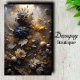 Esta obra maestra capta la tensión sublime entre la luz y la sombra, donde las flores de índigo profundo emergen de una oscuridad de tintes dorados ricamente atmosférica. La composición presenta una danza dramática de elementos botánicos - las peonías azules dominan el registro superior, mientras que delicadas flores de color crema-blanco proporcionan contrapuntos etéreos a continuación. Las hojas doradas atrapan luz invisible como metalizado quemada, sus bordes cuentan historias del tacto del otoño. El tratamiento claroscuro de la pieza evoca la Edad de Oro holandesa, mientras que su estilo dramático contemporáneo habla con sensibilidades modernas. Cada pétalo y hoja parece flotar en un espacio metafísico, creando profundidad a través de capas magistrales que se traducirán excepcionalmente en superficies de muebles, transformando piezas mundanas en arte de conversación. Pinturas de colores perfectas: Indigo profundo y dorado quemado Crema blanco y ahumado carbón vegetal latón antiguo y azul perla medianoche Perla blanco y dorado de la edad y gris tormenta Elementos de diseño cautivador: transiciones de luz a sombra Especies botánicas flotantes Detalles pétalos Intrincados Combinación de colores Sofisticada armonía efectos de profundidad Atmosférica Ideal Transformaciones de mobiliario: escritorio de secretario con múltiples cajones Mesas laterales de la era victoriana Cofre de bombé Decorativo pantallas plegables Paneles de la puerta del gabinete Este diseño eleva cualquier pieza de mobiliario que grava, creando un punto focal inmediato que requiere atención mientras mantiene un sistema de moderación sofisticado. Cuando se aplica a superficies antiguas, respira nueva vida en piezas cansadas, lo que sugiere elegancia atemporal y drama contemporáneo. La escala de las flores permite la colocación estratégica en paneles de muebles, creando una narrativa que se despliega a medida que se acerca la pieza. En cualquier salón grande, estudio o espacio de vida refinado, este diseño transforma el mobiliario en una instalación de arte que cuenta una historia de belleza atrapada entre el atardecer y el amanecer.