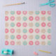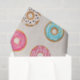 Este lindo diseño de patrón de donut y rociadores tiene varios sabores diferentes. Hay glaseado rosado con remolinos, glaseado azul y rosa con rociadores, e incluso un chip de chocolate de vainilla. Todo en un fondo de avena de color para equilibrar lo dulce. ¡Sí!