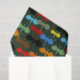 Un grupo de dragones en los colores de la mosca negra, marrón, roja, naranja, amarilla, azul y verde abren las alas a través de un fondo verde oscuro que se eleva hacia arriba. Los dragones son dibujados al estilo de un tatuaje tribal.