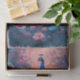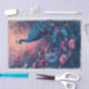 Un fondo pálido con filigrana enmarca un pavo real rodeado de delicadas flores rosas y azules.