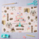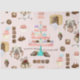 Trajes dulces con una torre de quequitos, pasteles y chocolates hechos a mano y el texto de la tipografía que dice: "¡Tantos postres, tan poco tiempo!" Pintado en acuarela y diseñado en un patrón de repetición de media caída totalmente escalable. Fondo rosa suave y rugoso con salpicaduras blancas. Todas las obras de arte fueron diseñadas gráficamente por la artista y diseñadora con licencia internacional Audrey Jeanne Roberts, copyright.