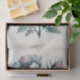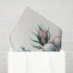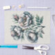 Un ramo meticulosamente ilustrado. Las flores predominan en los tonos verdes y grises, con detalles complejos que resaltan los pétalos y estambres. Hay un claro brote rojo en uno de los tallos, que contrasta maravillosamente con los tonos fríos del resto. Las hojas y tallos se representan con diferentes matices de verde, dando profundidad y dimensión a la composición. El conjunto se sitúa sobre un fondo glaciar-blanco, lo que permite que los colores de las flores aparezcan y que los detalles sean visibles.