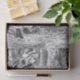 Este papel higiénico para tu envoltura de regalo tiene un dibujo vintage en blanco y negro de una pequeña capucha roja que lleva su capa encapuchada con una canasta y un ramo de flores parándose a hablar con el lobo en el bosque.