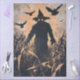 Espantapájaros con los brillantes ojos naranjas parados en un campo de maíz, rodeados de cuervos voladores contra un cielo morboso.