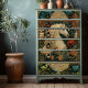 Artesanía Medieval De Decoraciones. Este vintage estampado botánico de arte rojo nouveau unicornio mezcla un unicornio crema y papas rojas en el follaje de jade de capas. Lo diseñé con un espíritu de William Morris con influencia medieval, equilibrando imágenes míticas y adornos botánicos detallados. El amable unicornio que se enfrenta aporta una nota amable al tema histórico. La composición apunta a París Art Nouveau de 1888, con arcos de tipógrafo en la parte superior e inferior para añadir texto.