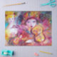 Amor romántico entre Arlecchino y Colombina. Violin colorido y caprichoso, una hermosa mujer rubia con disfraces espumosos de plumas, pintura artística acuarela, máscara de mascarada veneciana, con hermosos remolinos florales en chispas doradas, azul acuático, verde rojo, verde azulado, rosa, amarillo dorado, violeta, colores iridiscentes, Relieve metalizado dorado y plateado de Bulgan Lumini (c) Inspired de personajes de la Comedia del Arte ( Commedia dell' Arte ) , Carnaval de Venecia y máscaras de plumas venecianas. Este diseño fresco y artístico también es hermoso para ocasiones especiales, cumpleaños, navidades, vacaciones, El día de San Valentín, Mardi Gras ( Martes Gordo ) temporada,