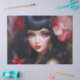 Retrato de una Princesa de Flor Cuta con vestido negro rodeada de flores y mariposas de colores. Arte original de Gifts_AtTheCorner Mjm ©2023.