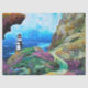Faro encaramado en el borde de un acantilado sobre el océano en tonos azules de oro verde y violeta AI Generated Art por minx267