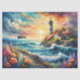 Hermoso jardín colorido, faro al amanecer en un océano azul