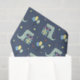 Cocodrilo verde sobre sus patas traseras sosteniendo un hermoso regalo envuelto y una cuerda de globos amarillos y azules. Estrellas amarillas, triángulos y puntos rojos también en un fondo azul oscuro.