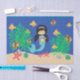 Este papel seda hermoso de la fiesta en la piscina del cumpleaños ofrece una sirena con el pelo oscuro en colas de caballo que nada en el océano con sus amigos de la criatura del mar. Algunos gráficos por AMBillustrations.