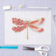 Dibujado artísticamente, dorado, libélula con joyas de color rojo y alas decoradas con rojo, floreciente, cerezo japonés con joyas sobre fondo blanco. Dragonfly de oro.