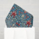 Intricate floral pattern with red, cream, and green leaves on a blue background. Symmetrical design evokes a classic, elegant, and ornate feel.