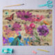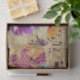 Este diseño es vívido y cuenta con un pavo real turquesa, flores violetas, magenta, azules y naranjas, así como una mariposa roja adorable, con el telón de fondo de una partitura musical vintage. Este patrón retro es expresivo, alegre y único, con una mezcla de texturas y colores.