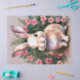 El papel de tejido presenta una acuarela de un lindo conejo conejito enmarcado por flores rosas en este retrato floral botánico animal.