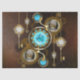 Lentes turquesa con un reloj de antigüedades con engranajes de latón y llaves doradas sobre un fondo oxidado y marrón. Estilo Steampunk.