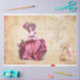 Señora del siglo XVIII, vestida de rosa con gorra, con un fondo de escritura francesa.