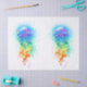 Gran medusa de gelatina, de dibujo artístico y brillante, con largos tentáculos sobre blanco, pintados con fondo multicolor de acuarela. Marisco arcoiris.