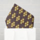 Repeating geometric pattern with orange and blue hexagons forming floral shapes on a dark background. The design conveys a retro, symmetrical feel.