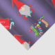 Un patrón dulce y caprichoso de elfos (o gnomos) de Navidades pequeños en gorras rojos, con largas barbas de arbustos, rodeados de coloridas medias de Navidades a rayas y saludos de Navidad rojos diciendo, "Feliz Navidad", todo en un colorido fondo azul.