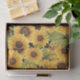 El artista le da al cliente plenos derechos para adaptar este diseño y aplicarlo a otros productos del catálogo de Zazzle. Los grandes girasoles pintados se representan en un fondo marrón rústico. Puede duplicar, redimensionar y reubicar los girasoles según sus especificaciones. Le impresionará la impresión a color de alta calidad y vívida.