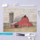 Un collage de acuarela de un granero rojo sobre un fondo de escritura. Ideal para envolver regalos, manualidades o proyectos de decoupage.