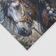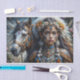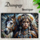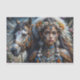 Este retrato impresionante fusiona elementos de fantasía e inspiración indígena en una impresionante exhibición de detalles ornamentales y poder espiritual. La composición combina magistralmente un noble corcel con una figura adornada, ambos embellecidos con una regalia intrincada que presenta acentos de turquesa, oro y plata. El rostro del sujeto lleva delicados patrones ceremoniales azules que reflejan los elementos decorativos de su elaborado traje, mientras que su tocado combina girasoles, flores blancas y plumas en una corona regia.