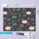 A bold, elegant Halloween repeating pattern set against a rich black background, featuring sleek black cats with glowing green eyes, jewel-toned pumpkins in emerald, amethyst, ivory, and deep sapphire, and classic spooky accents. Crescent moons, bats, spiderwebs, tiny spiders, stars, fleur-de-lis motifs, and witches’ hats are arranged in a balanced, decorative rhythm that feels luxurious rather than scary. The high-contrast palette and softly textured illustration style give the design a glamorous, slightly mystical feel.
