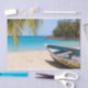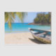Papel de tejido con una idílica escena tropical en la playa. Agua azul turquesa cristalina y una playa de arena fina de color marrón. Algunas hojas de palmera cuelgan desde arriba. En la playa hay una vieja barca de madera. Un paisaje tranquilo y sereno.