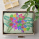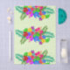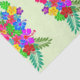 Bold floral design tissue paper with hibiscus flowers and big leaves. Multicolor swag in red, blue, yellow, purple and green is repeated in a large pattern over pale green paper. A unique and creative design for crafts or wrapping summer party gifts.