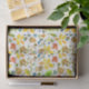 Papel de tejidos con temática natural que presenta objetos encontrados en el suelo forestal como caracoles, follaje, setas, rocas y más ilustrado con acuarela en tonos otoño de amarillos dorados, azules y tonos tierra. ¡Muy bonito para los regalos de otoño!