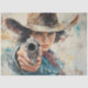 La imagen es una foto pintada que muestra a una mujer policía apuntando con una pistola al ladrón de un banco. El sheriff está vestido con la vestimenta occidental tradicional, incluyendo un gorra de gran tamaño, un abrigo largo, un chaleco y un cinturón con una funda. Su postura es segura de sí misma y asertiva, con una mirada decidida en su rostro. El paisaje es desértico y escarpado, con montañas y un cielo nublado, lo que contribuye a la atmósfera dramática e intensa de la escena. El uso de pinceles audaces y colores vibrantes aumenta el impacto general de la imagen, haciéndola llamativa y evocadora. Alguacil mujer con fotografía pintada, ladrón de arma apuntando, vestimenta occidental, gorra con gran cereal, abrigo largo, paisaje desértico escarpado, brushstrofes dramáticas e intensas, colores vibrantes