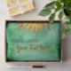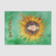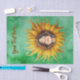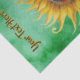 Este papel de tejido para tu envoltura de regalo o artesanía tiene un gran girasol amarillo y marrón con la cara de una niña dulce en el centro de la flor sobre una acuarela vibrante que se ve verde. Personalizar el texto con la plantilla.
