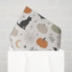 A calm, modern farmhouse–inspired Halloween pattern with a soft, neutral color palette. Stylized pumpkins in muted pumpkin orange, sage green, and warm ivory are scattered among simple black cat silhouettes, minimalist bats, crescent moons, delicate spiderwebs, tiny spiders, leafy sprigs, and subtle stars. Set against a light linen-textured background, the design feels understated, cozy, and elegant.