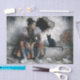 This decoupage tissue paper features a modern woman seated against a distressed brick wall, styled in bold contemporary fashion, paired with a striking black cat. The layered textures, expressive posture, and urban backdrop create a powerful narrative piece ideal for statement furniture and artistic decor.