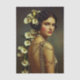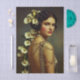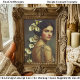 Retrato vintage inspirado en Art Nouveau de una mujer con arreglo floral de lirio de cala y vestido adornado con oro antiguo, fondo de salvia y taupe desvanecidos, obra de arte romántica y elegante para decoupage y restauración de muebles. Este refinado retrato presenta a una joven mujer posando suavemente sobre su hombro, su expresión tranquila y segura de sí misma. Su cabello oscuro está peinado en una suave onda vintage, adornado con lirios de cala de marfil esculturales que caen elegantemente por su espalda, creando una línea floral vertical dramática. Lleva un vestido de oro antiguo con detalles intrincados, drapeado de cadena delicada, acentos de perlas y adornos inspirados en Art Déco. El fondo suave de salvia y tauro desvanecidos realza los tonos cremosos de los lirios mientras complementa el calor de los detalles