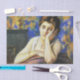 Este diseño presenta un cuadro del pintor impresionista italiano Federico Zandomeneghi (1841-1917). Muestra a una joven elegante inclinada contra la parte de atrás de una silla. Ella tiene la mano apoyándose en su cabeza y está sonriendo suavemente. La mujer tiene pelo de morena limpio y ojos azules. Ella está sentada en una sala de estar con papel pintado de colores vivos. Parece que hay una chimenea detrás de ella.