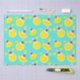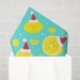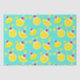 Navidades papel de tejido con un patrón de limones sonrientes usando sombreros de santa en un brillante fondo verde azulado.