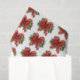 Papel de tejidos con Navidades festivos se inclinan en rojo y oro. Rodeado de flores de poinsettia, pino y decoración navideña.